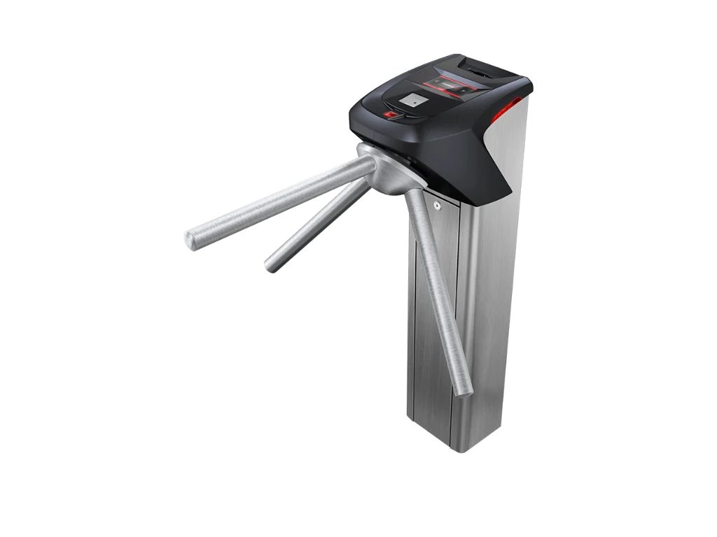 Catraca de acesso modelo pedestal com leitor biométrico, cartão de proximidade e senha.